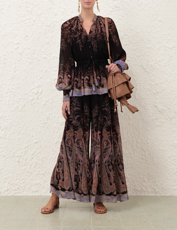 Kalhoty Alchemy Culotte v černém paisley vzoru z naší jarní kolekce 2026, Kindred Spirit. Kalhoty se středně vysokým pasem a délkou ke kotníkům, s pevným pasem a rozšiřujícím se lemem.