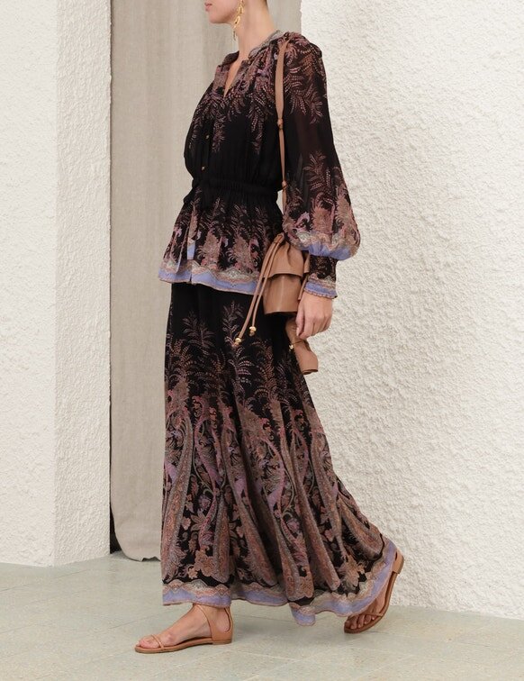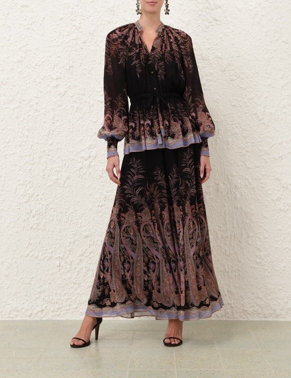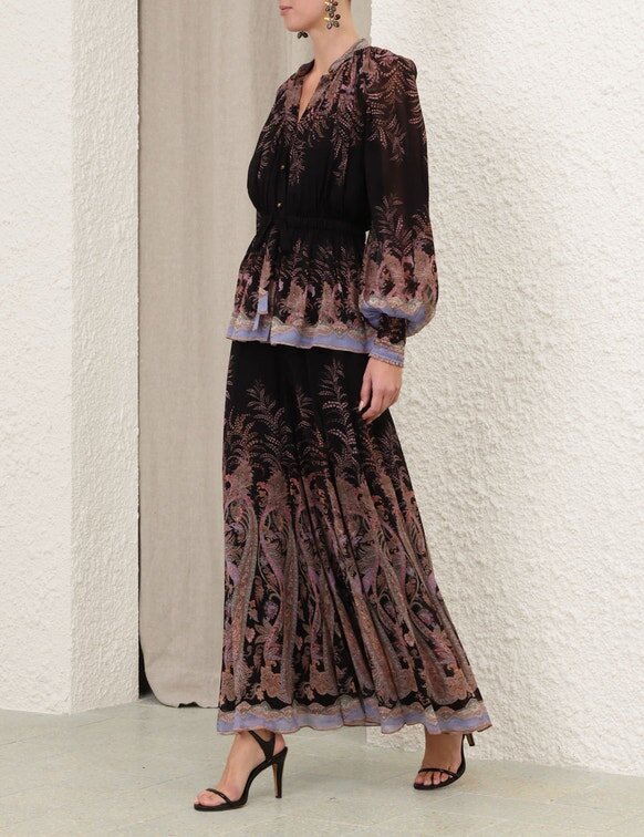 Kalhoty Alchemy Culotte v černém paisley vzoru z naší jarní kolekce 2026 Kindred Spirit. Kalhoty se středně vysokým pasem, délkou ke kotníkům, pevným pasem a rozšiřujícím se lemem.