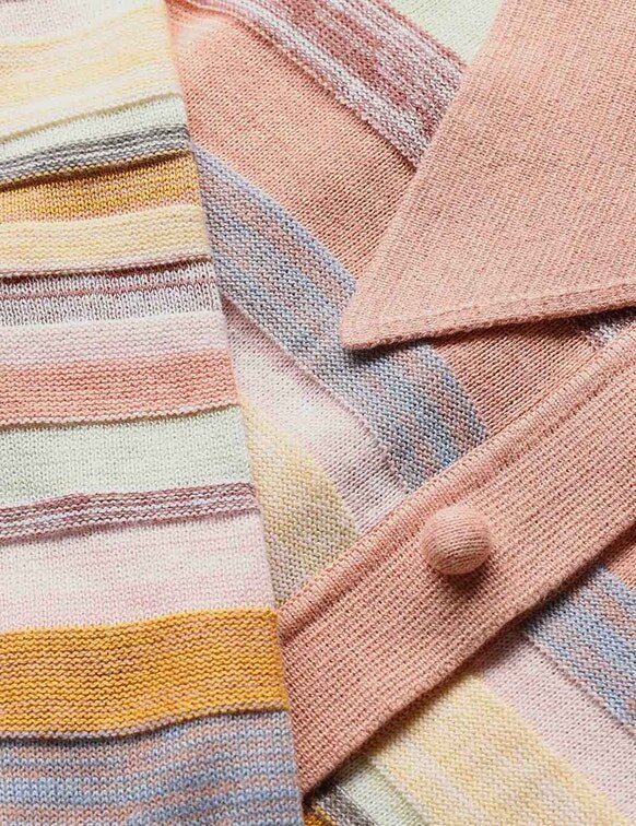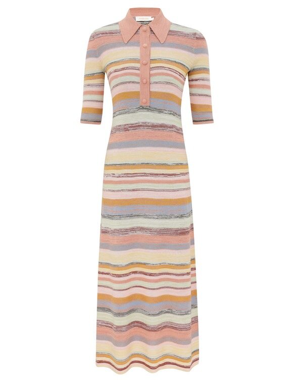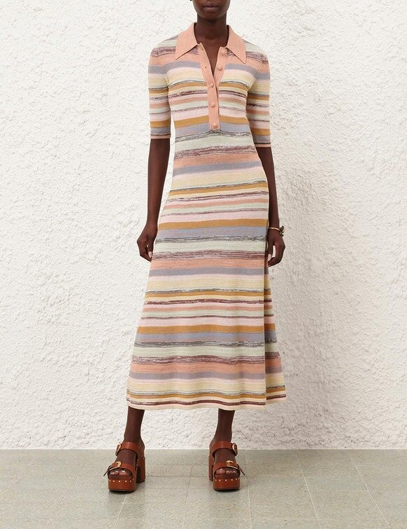 Midi šaty Luna Mouline Polo s vícebarevnými pruhy z naší jarní kolekce 2026, Kindred Spirit. Midi šaty z bavlny a lnu s klasickým límečkem, tříčtvrtečními rukávy, zapínáním na knoflíky uprostřed vpředu a volnou plisovanou sukní.
